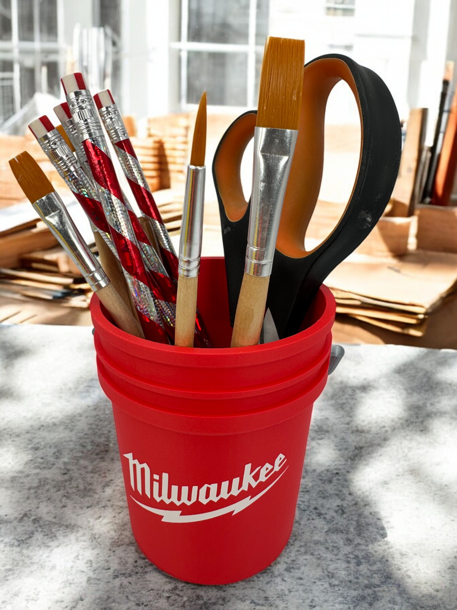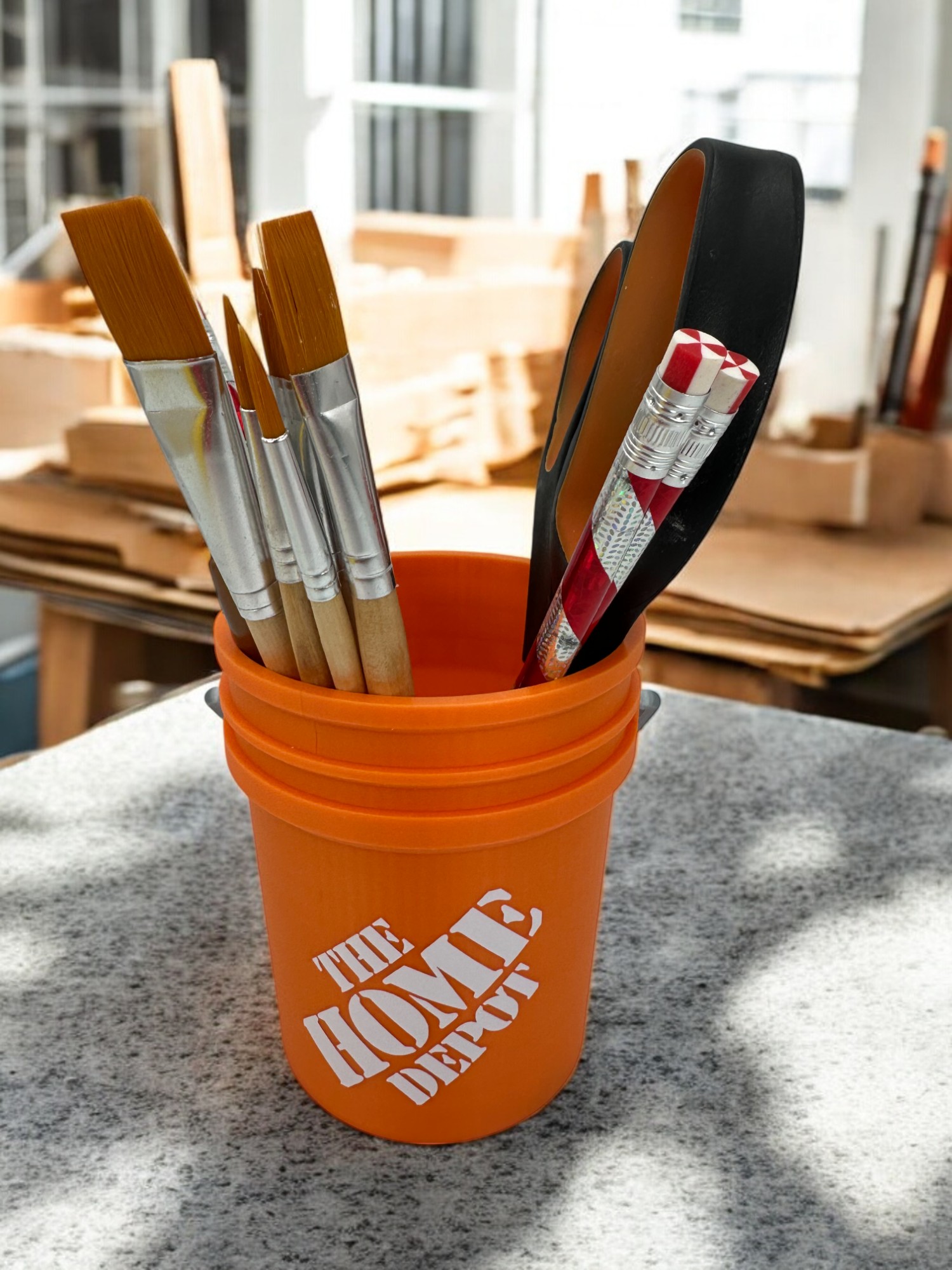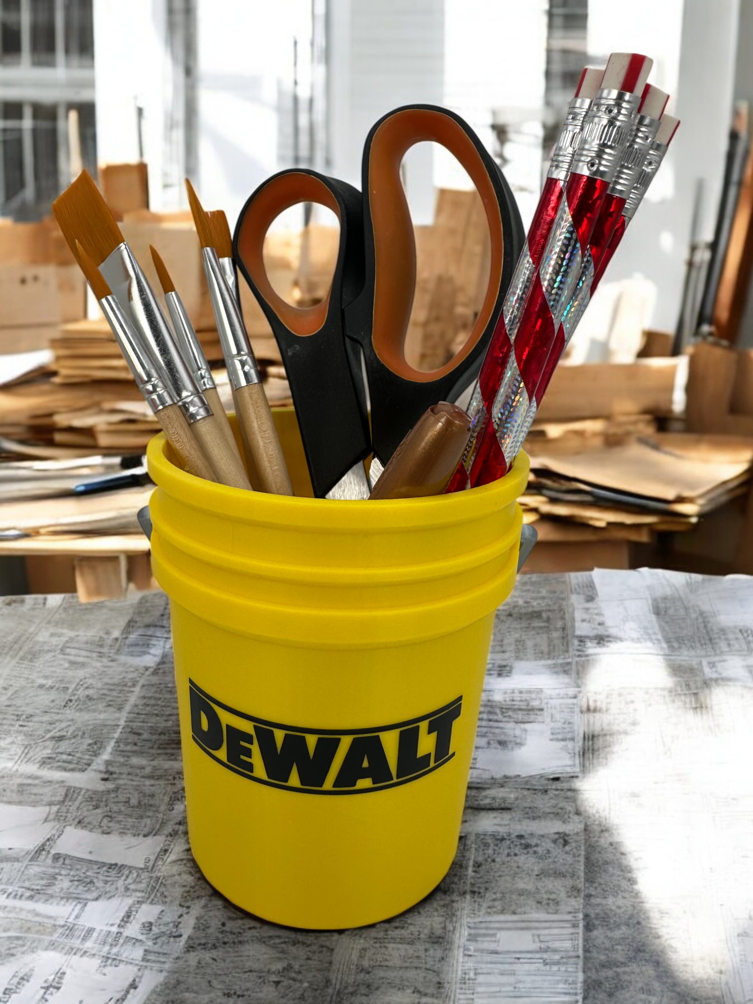 Add a little industrial flair to your workspace and make organizing your desk a breeze with this one-of-a-kind 5-gallon bucket organizer.