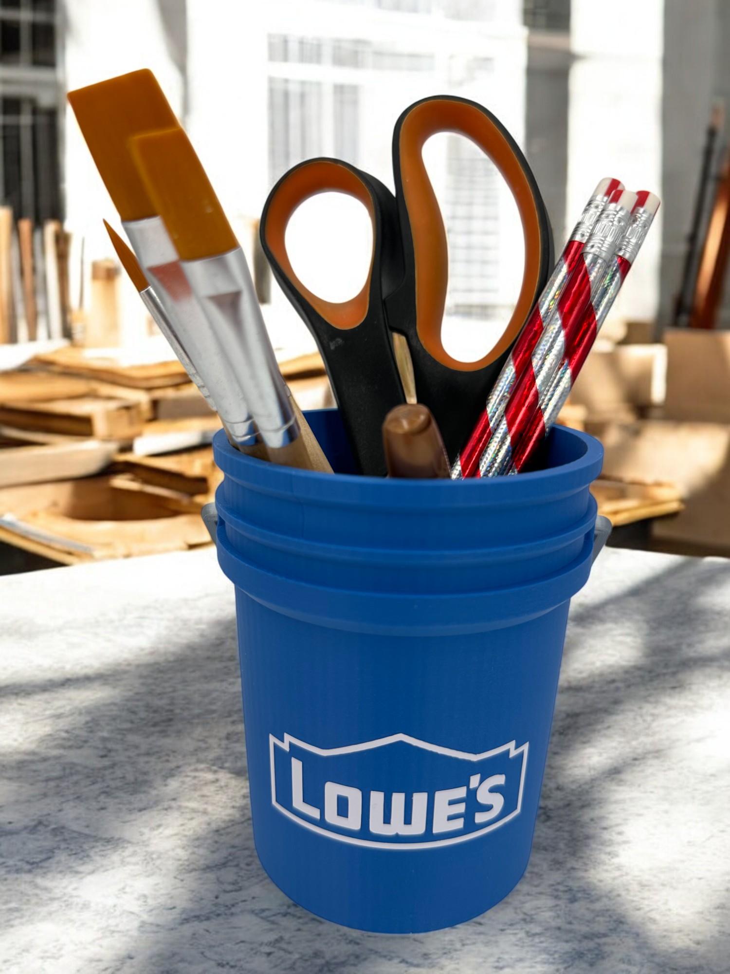 Get organized in style with this unique 3D printed 5-gallon bucket desk organizer, designed to hold all your essential office tools like pens, pencils, paint brushes, scissors, and more! This fun and functional organizer is a miniature version of a classic 5-gallon bucket, measuring approximately 3.5 inches wide by 4 inches tall, and features a simulated metal handle for added realism and durability.