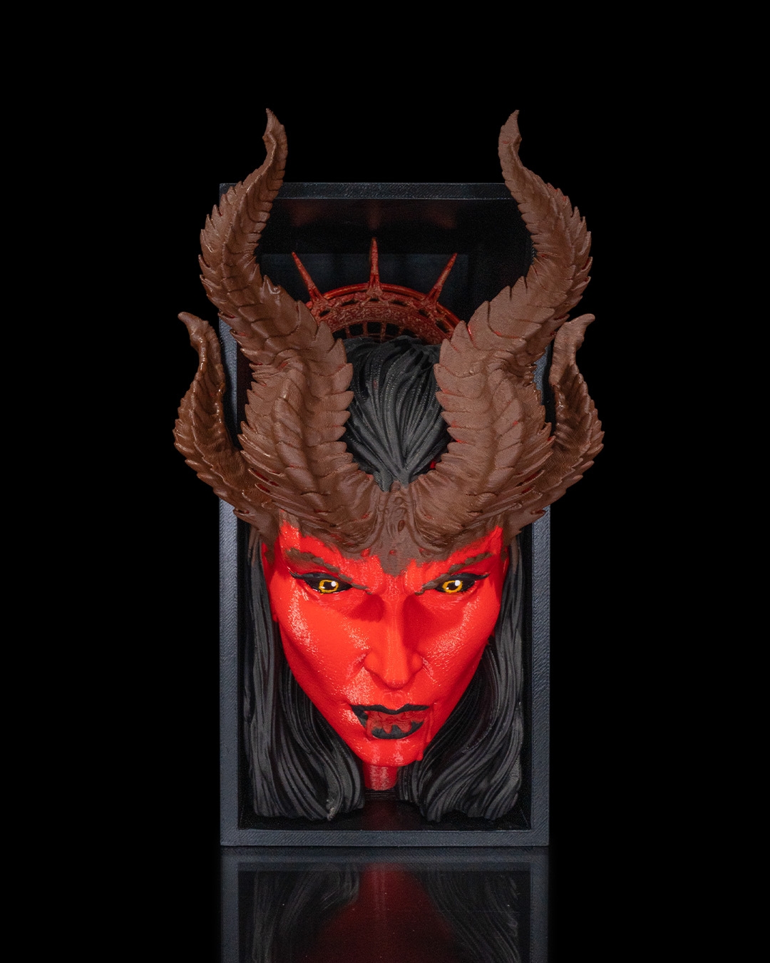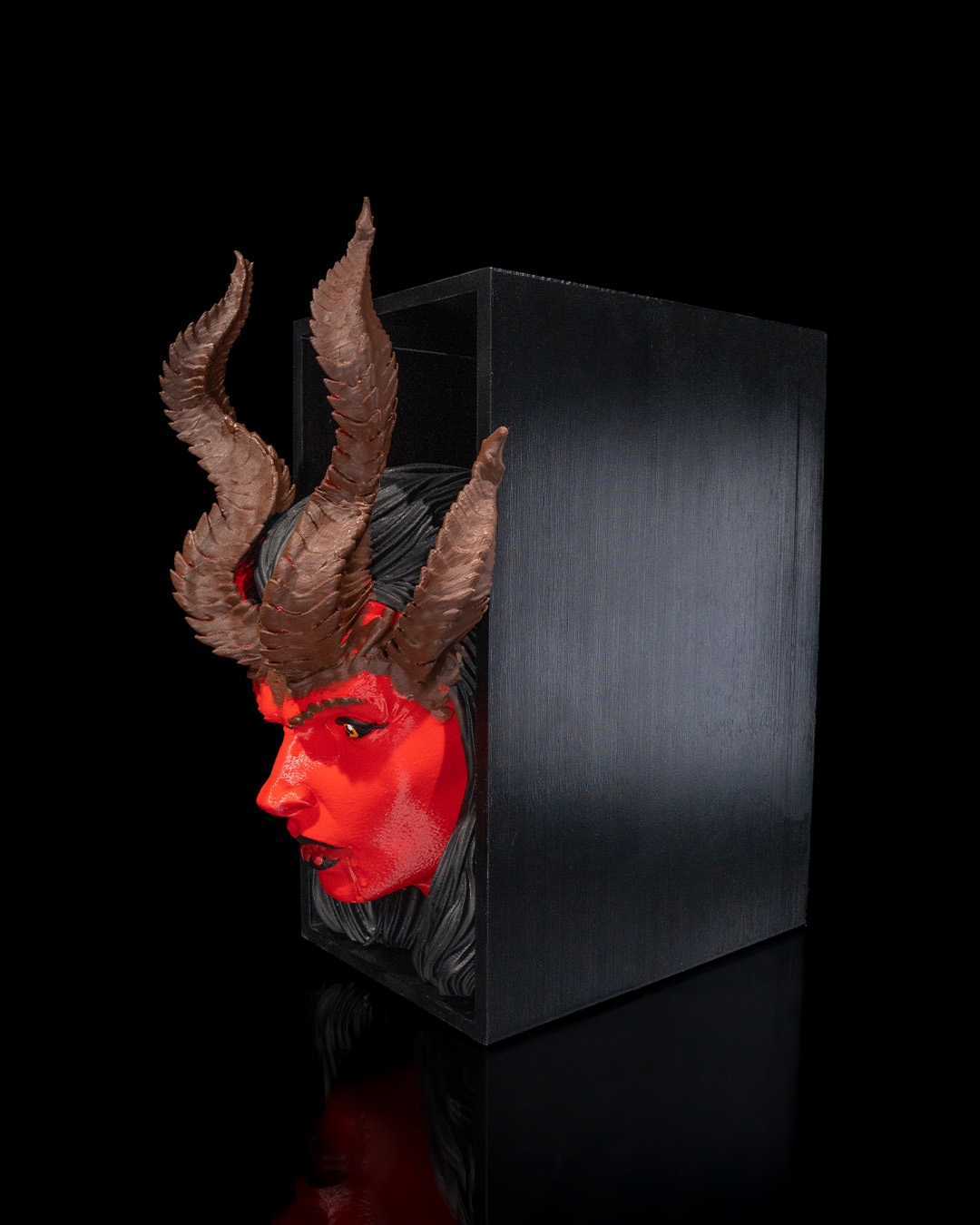 Uma súcubo encantadora entre prateleiras de livros, atraída não por almas, mas por literatura. Uma peça envolvente para estantes ousadas e temáticas.