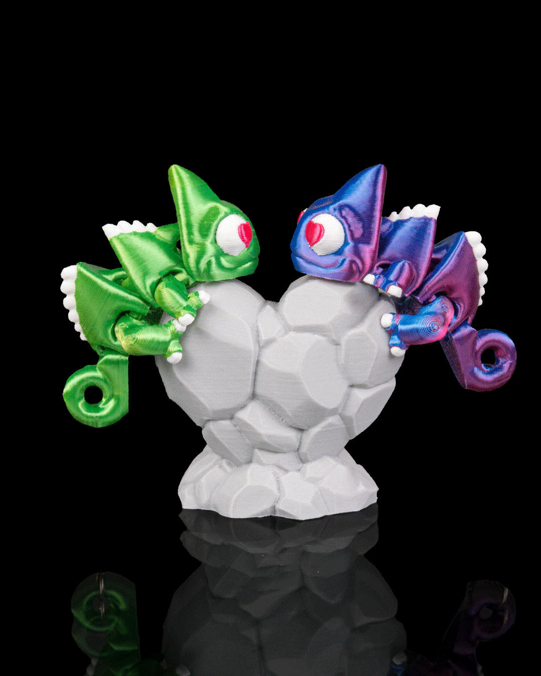 Two chameleons, perfectly matched no matter the colors they wear.
