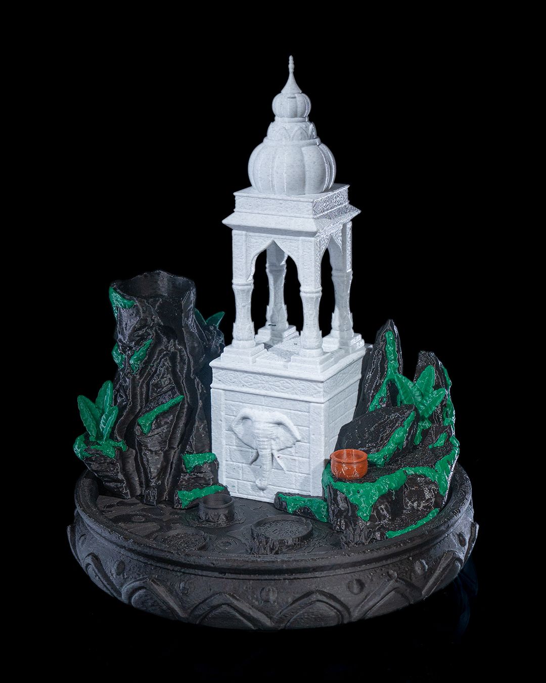 Cette cascade d’encens crée un doux filet de fumée qui descend lentement entre les rochers, contournant un majestueux temple sculpté.