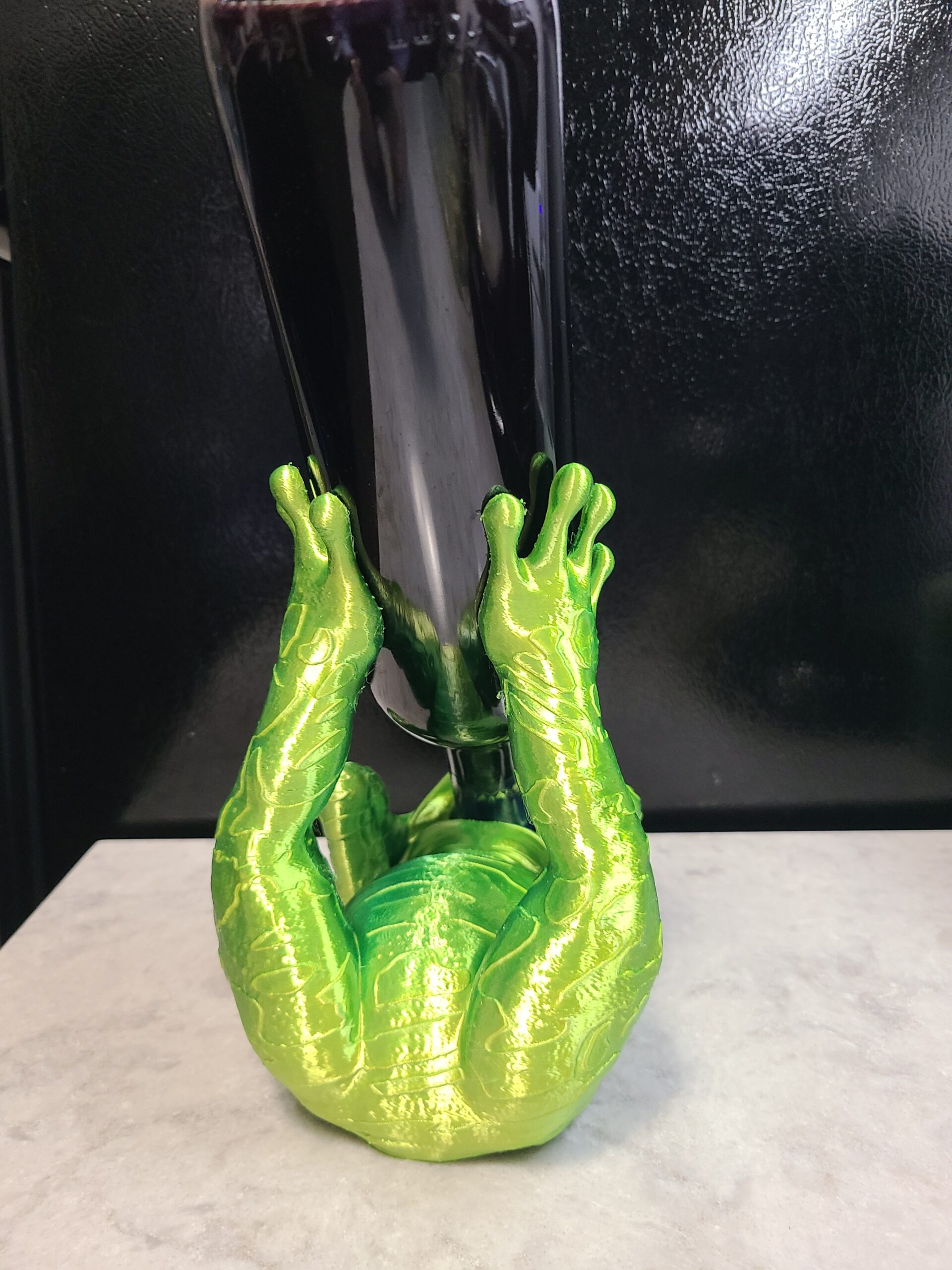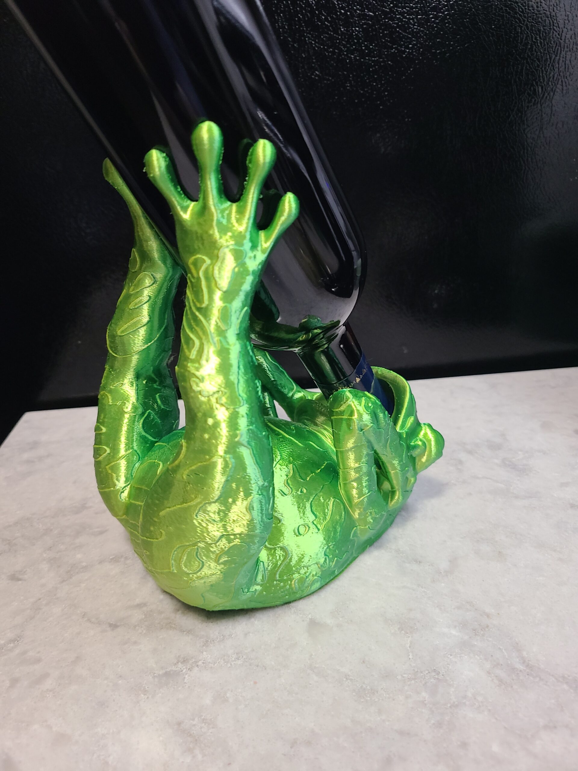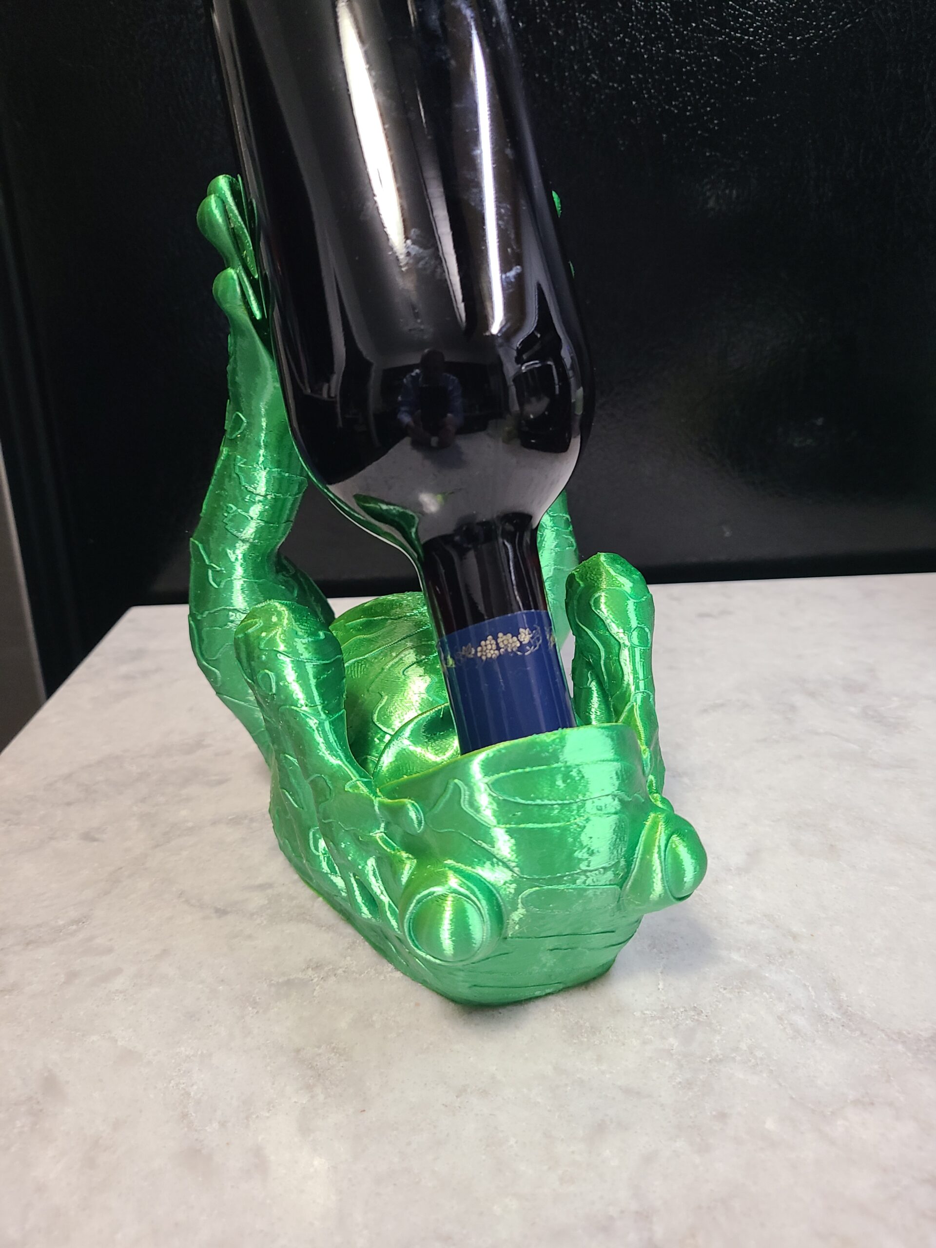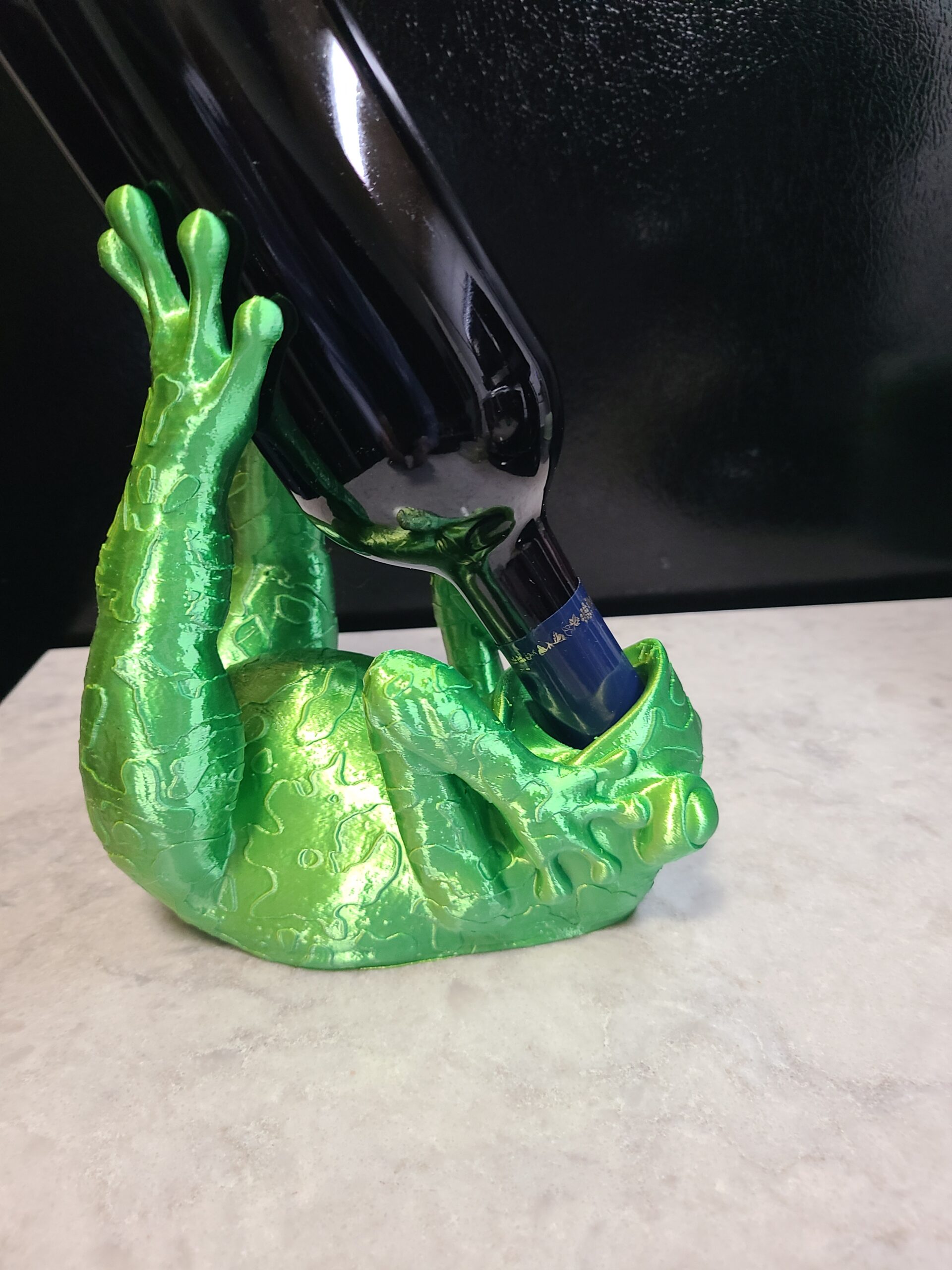 Let Mr. Frog hold onto your wine for you. By the way, he only took a sip. Makes a nice centerpiece for your next dinner party. Made from bi-extruded green and yellow silk PLA. Changes colors as you rotate it.