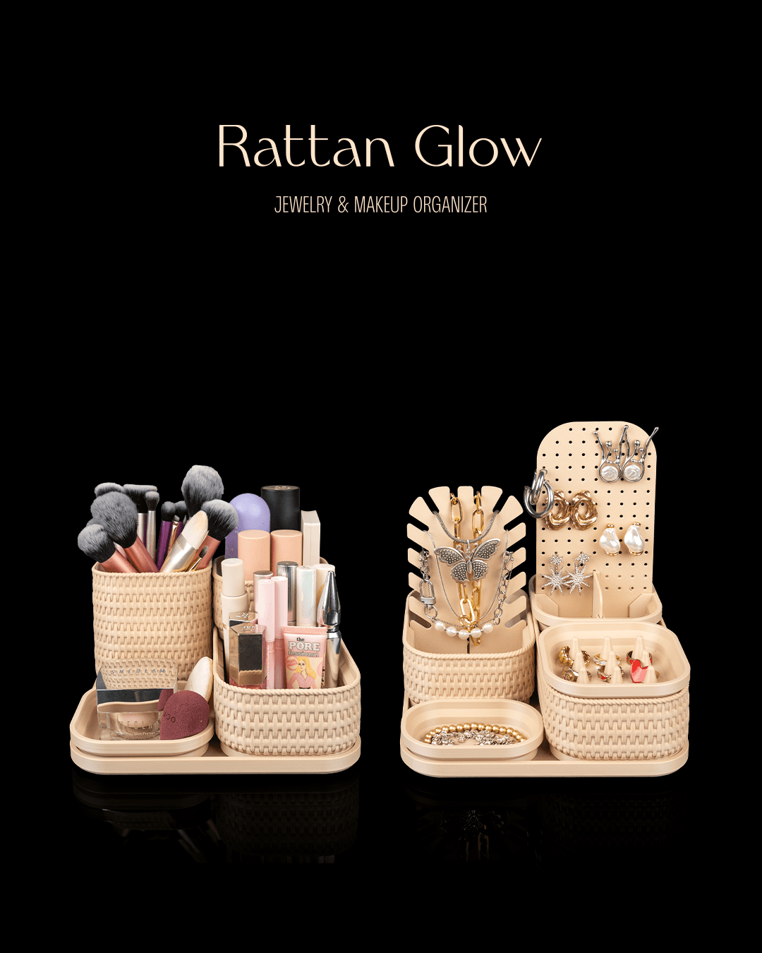 Whether you’re organizing rings, earrings, brushes, or skincare essentials, Rattan Glow transforms everyday storage into a stylish display that feels both calming and luxurious.