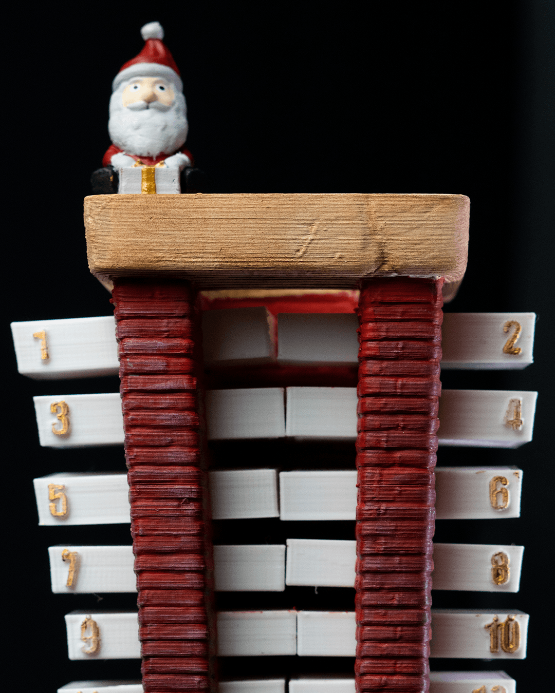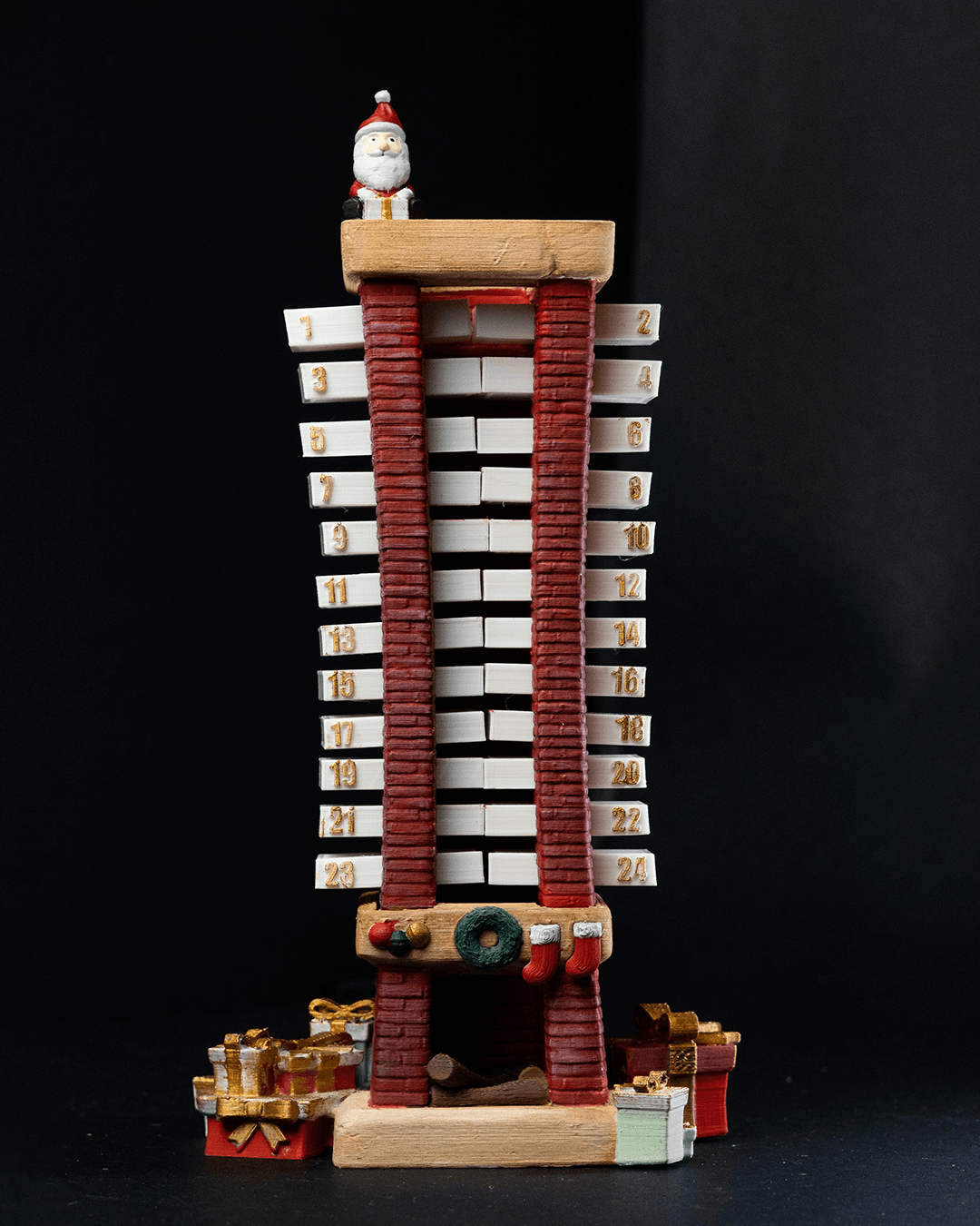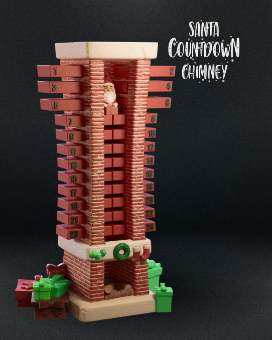 The image shows a Santa Countdown Chimney, a festive decorative item designed to count down the days until Christmas. The chimney looks like it’s made of brick and features numbered slots from 1 to 24 on both sides. There’s a small Santa figure that can be moved down the chimney each day as Christmas approaches. At the base of the chimney, you’ll find Christmas decorations like a wreath and presents.