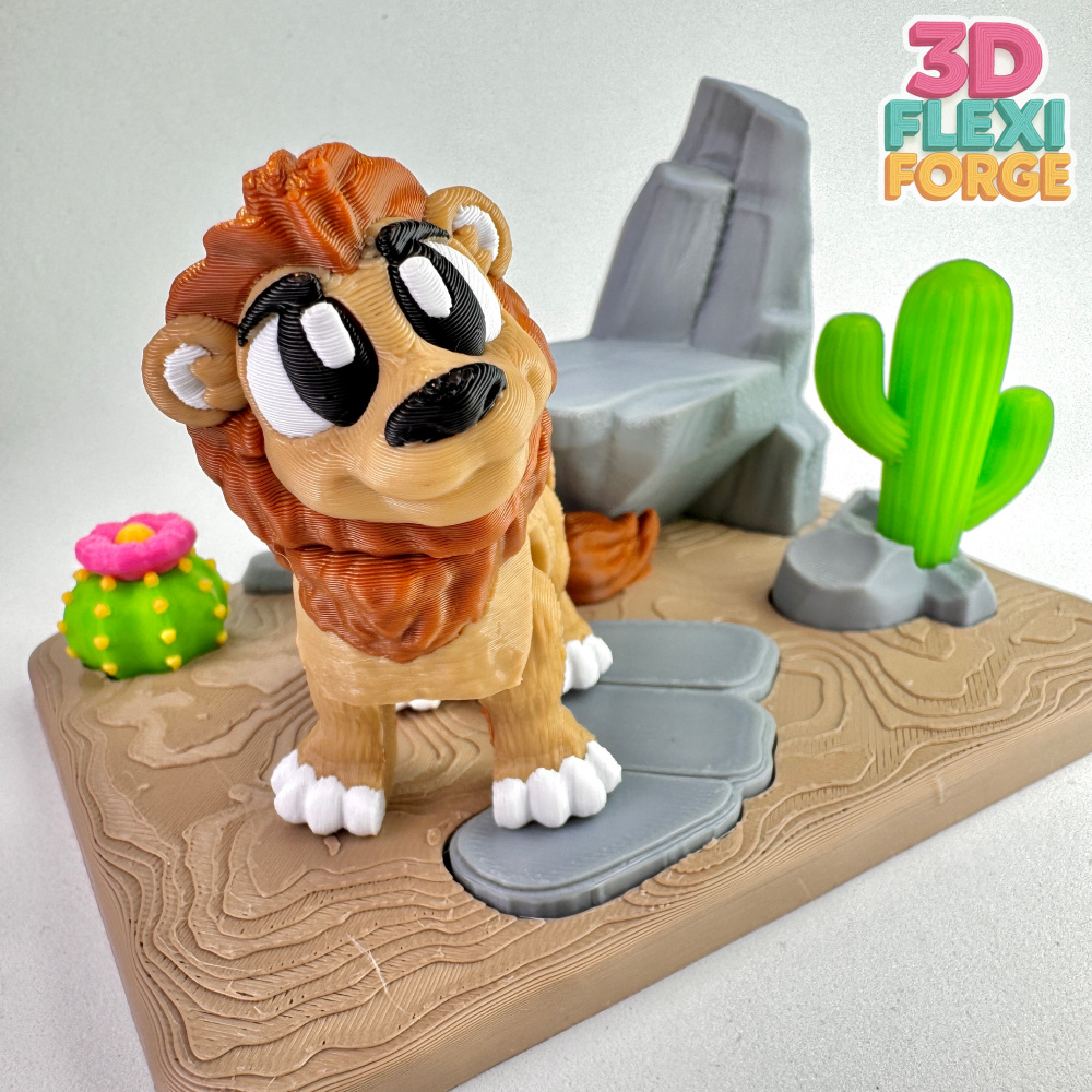 This new design features a cute flexi lion resting in a stylized semi-desert environment