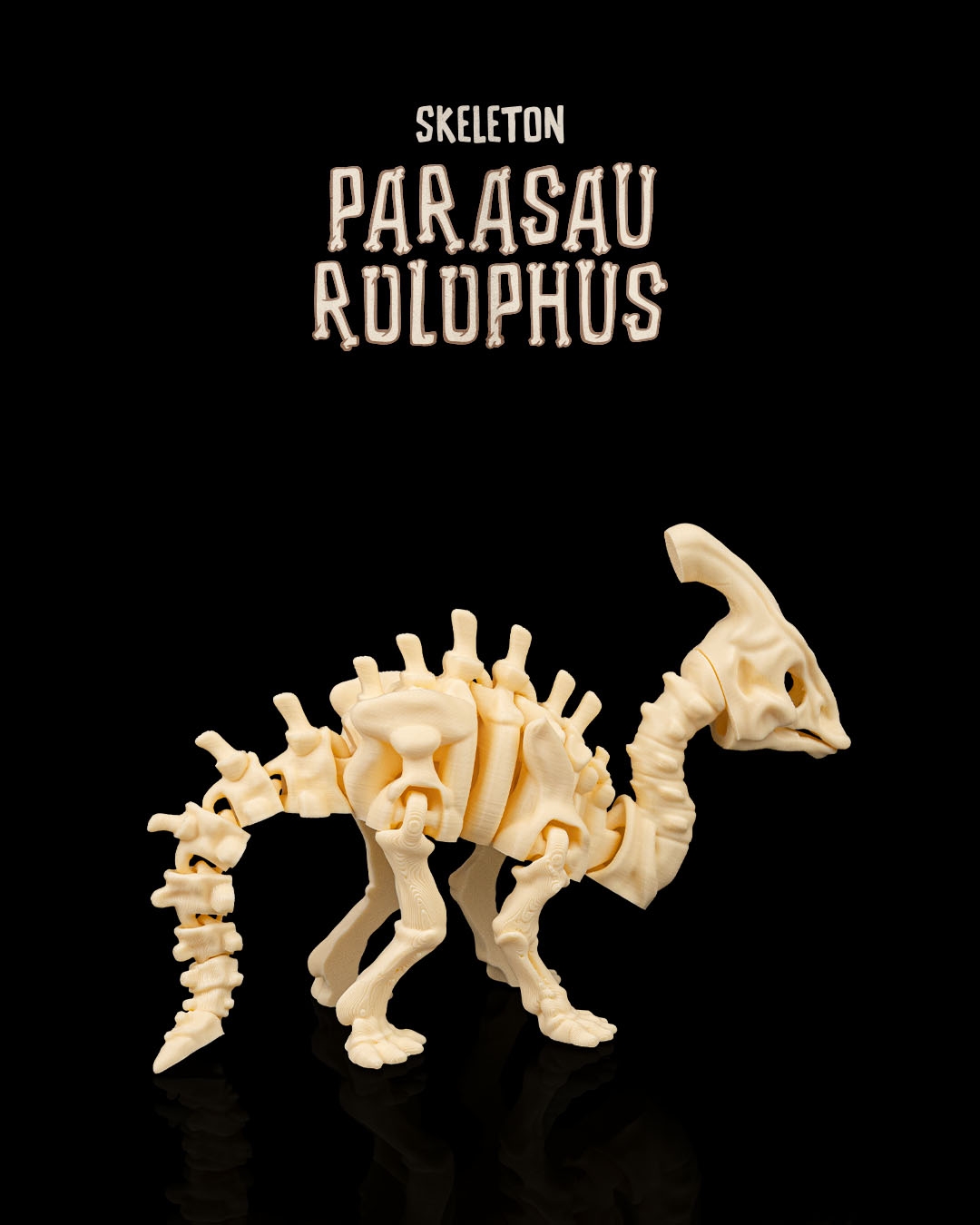 This 3D printed Parasaurolophus skeleton is an elegant and distinctive model that captures the graceful form of this well‑known crested dinosaur. Its balanced proportions and signature head crest make it an eye‑catching piece for collectors, educators, and dinosaur enthusiasts.
