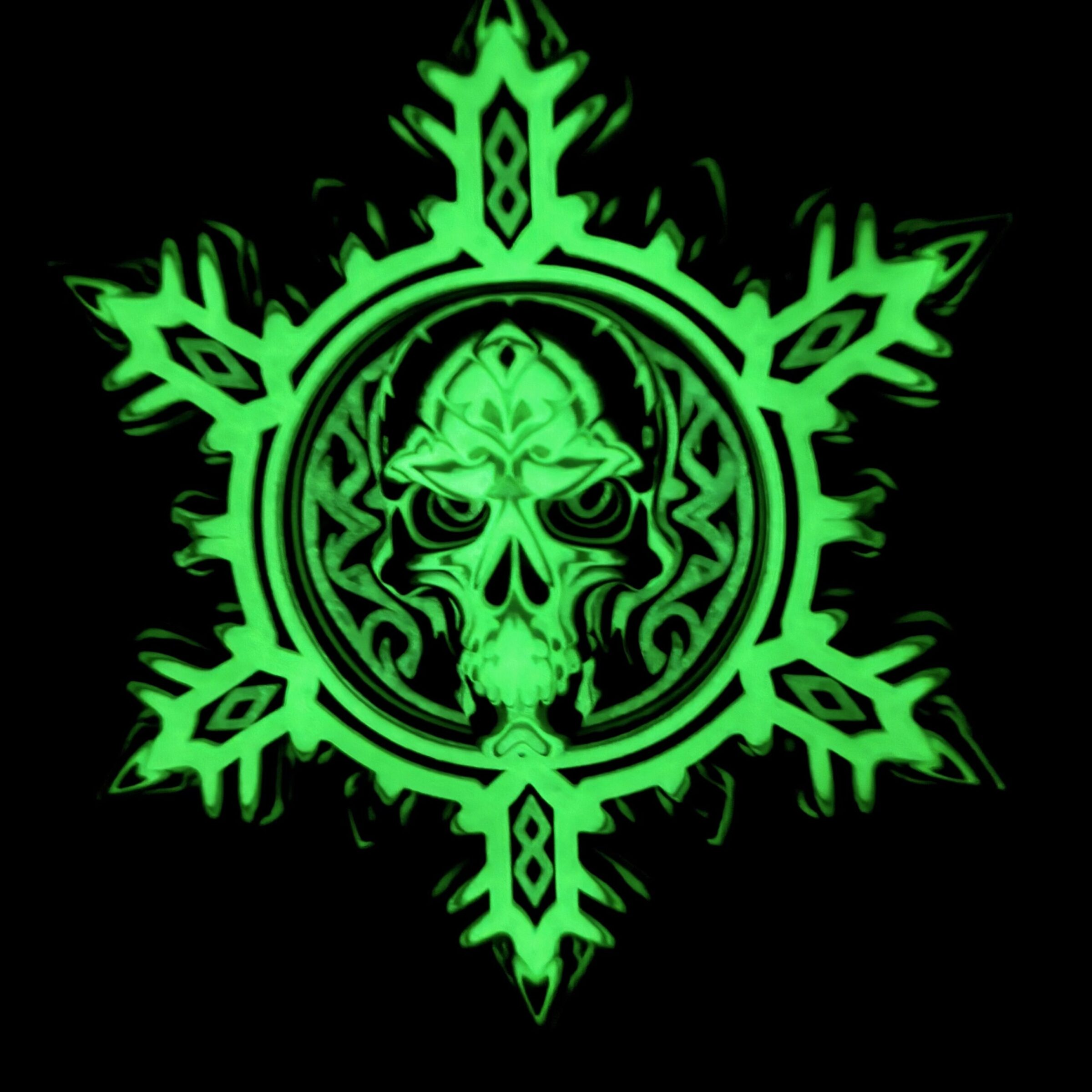 The ornament uses a dual-color scheme, primarily black and neon green. The green portions of the snowflake and skull are printed with glow-in-the-dark filament, allowing them to emit a soft, eerie glow after exposure to light. This effect highlights the patterns and edges of the design, making it visually striking both in daylight and darkness.