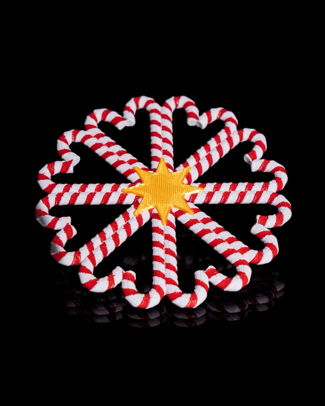 The image shows a decorative object that resembles a star made from twisted red and white striped material, likely candy or a candy-like material. The star has a yellow center and is set against a black background. Above the star, there is text in a stylized red font that reads “Star” and below it, in smaller red letters, “BARLEY SUGAR.”