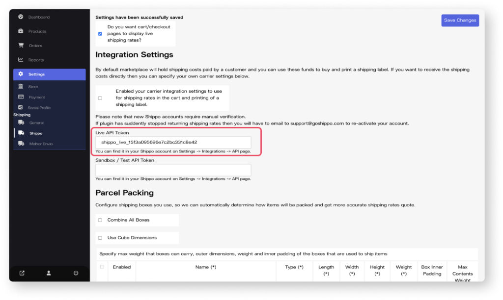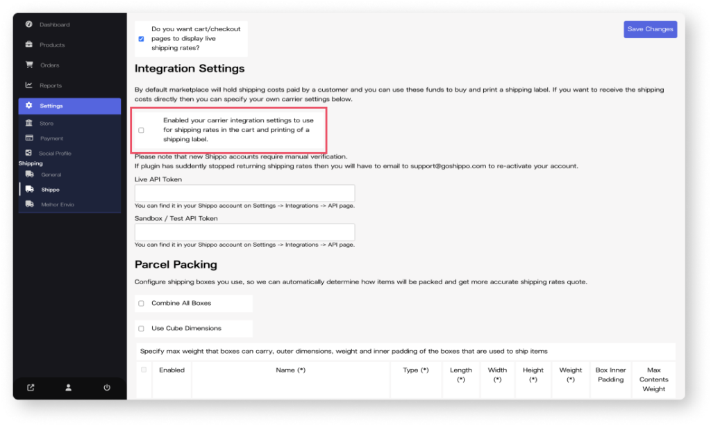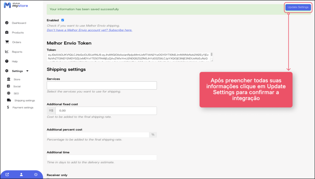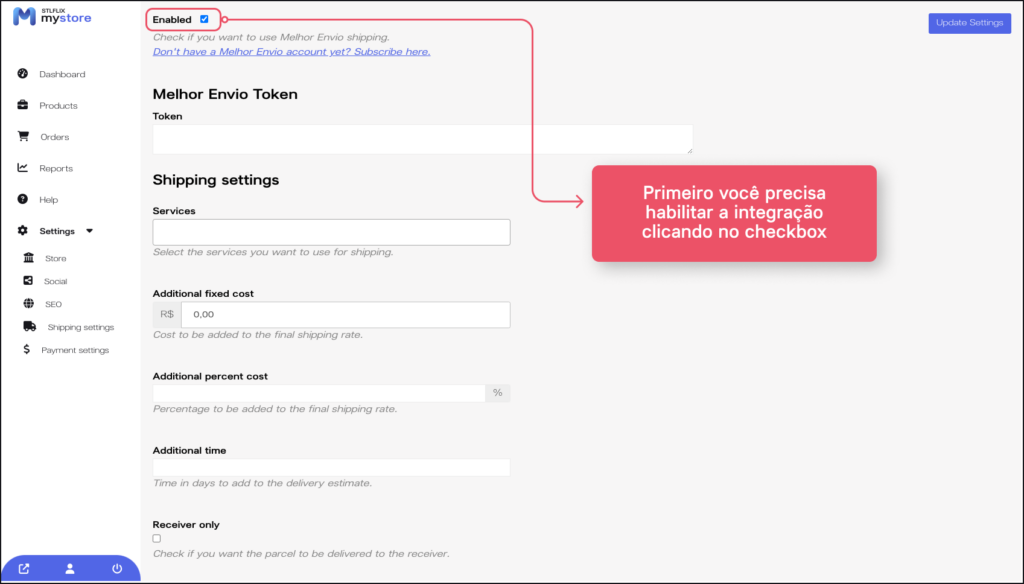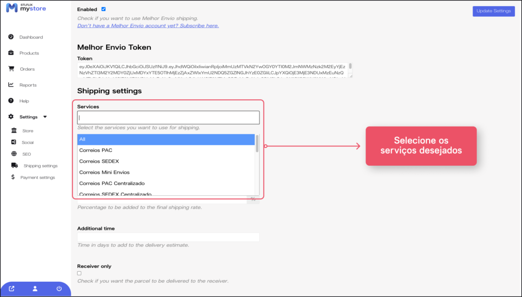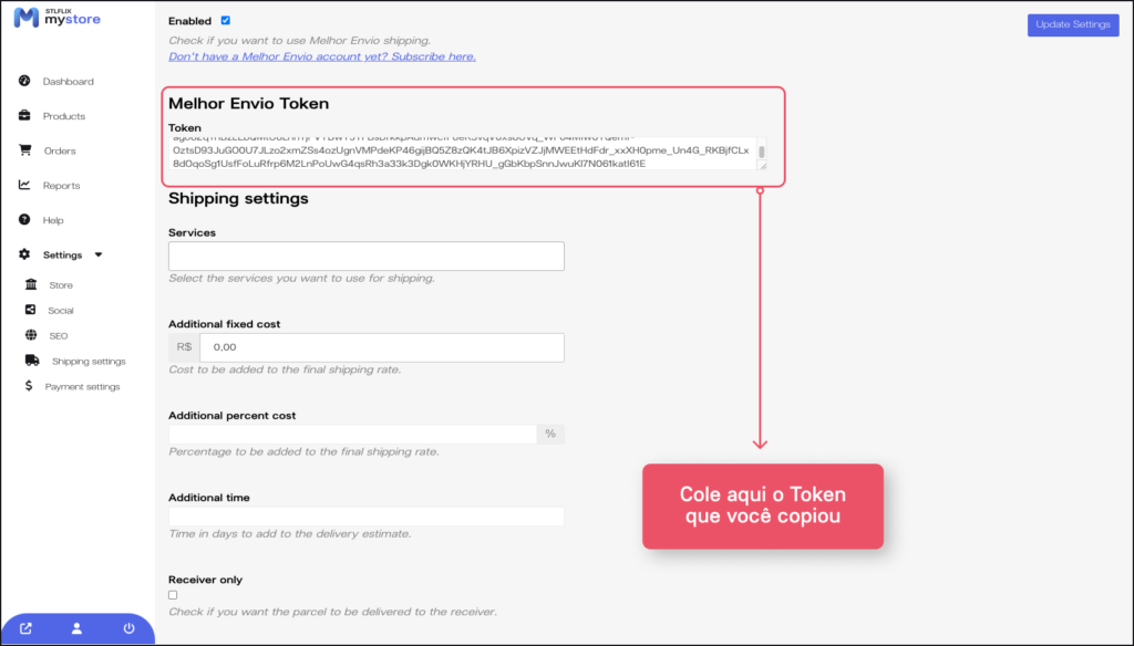 2. Com o token já copiado vá novamente ao menu de “Shipping settings” selecione a opção do Melhor Envio