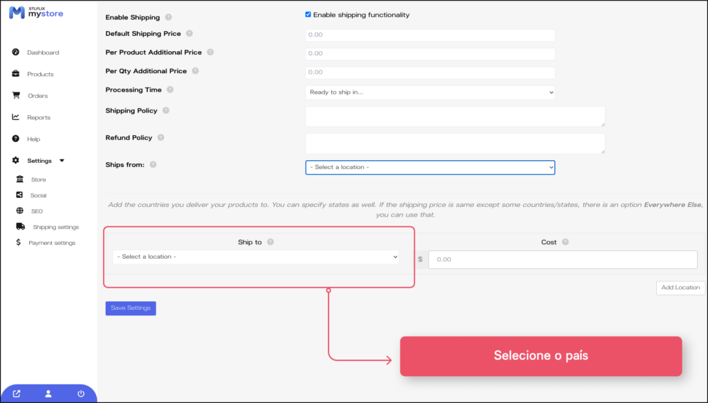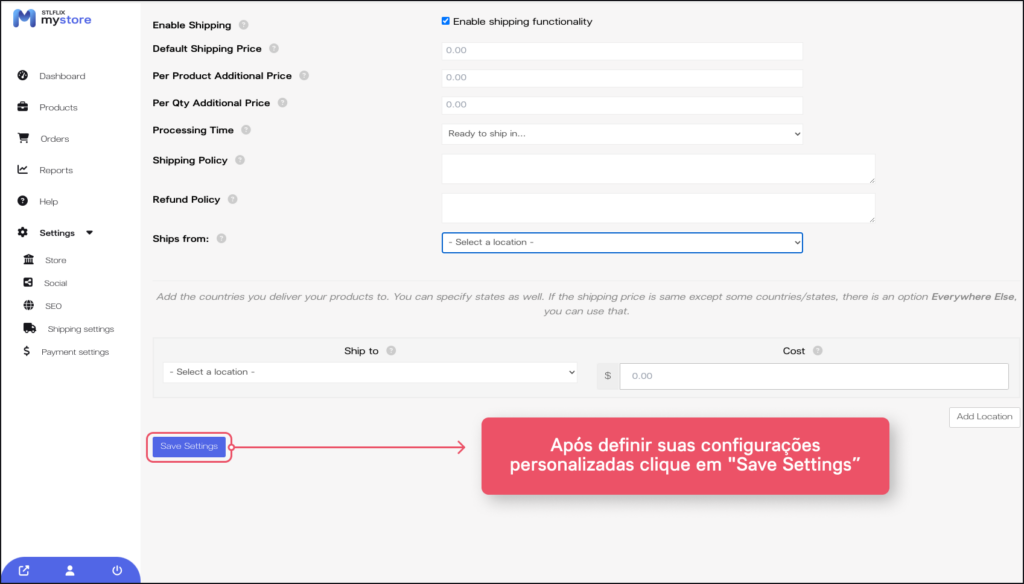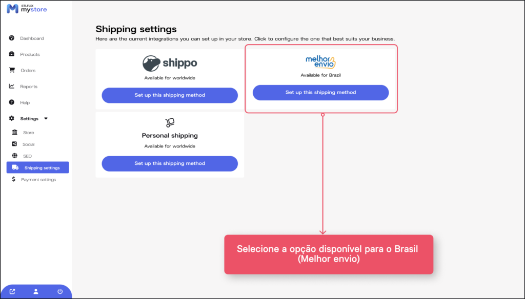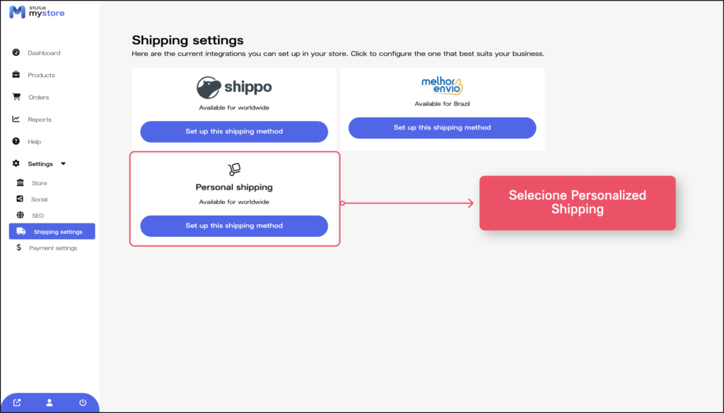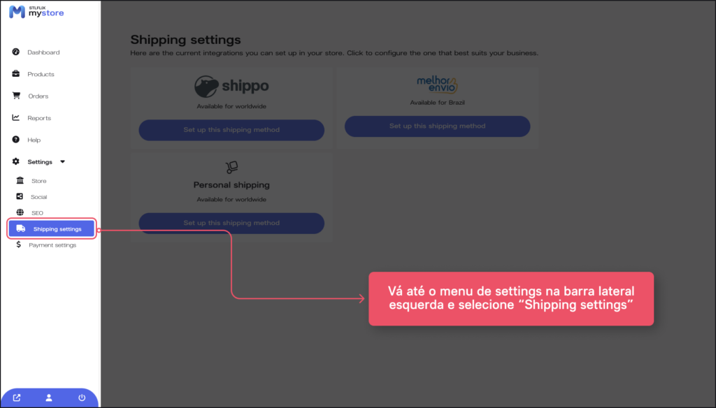 No menu à esquerda, acesse novamente a opção de “Settings”, vá em “Shipping Settings”e escolha seu método de envio (Integração com “Melhor Envio” para o Brasil ou Personal Shipping para definições manuais como preço fixo, frete grátis e outros).