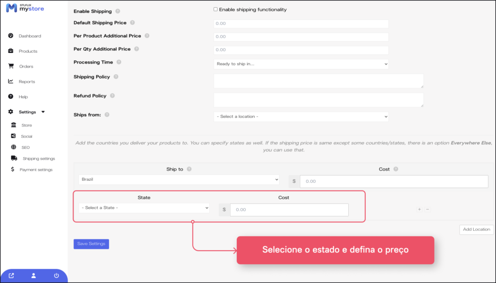 4. Surgirá uma nova opção para estados, selecione o estado desejado e adicione o preço de frete específico.