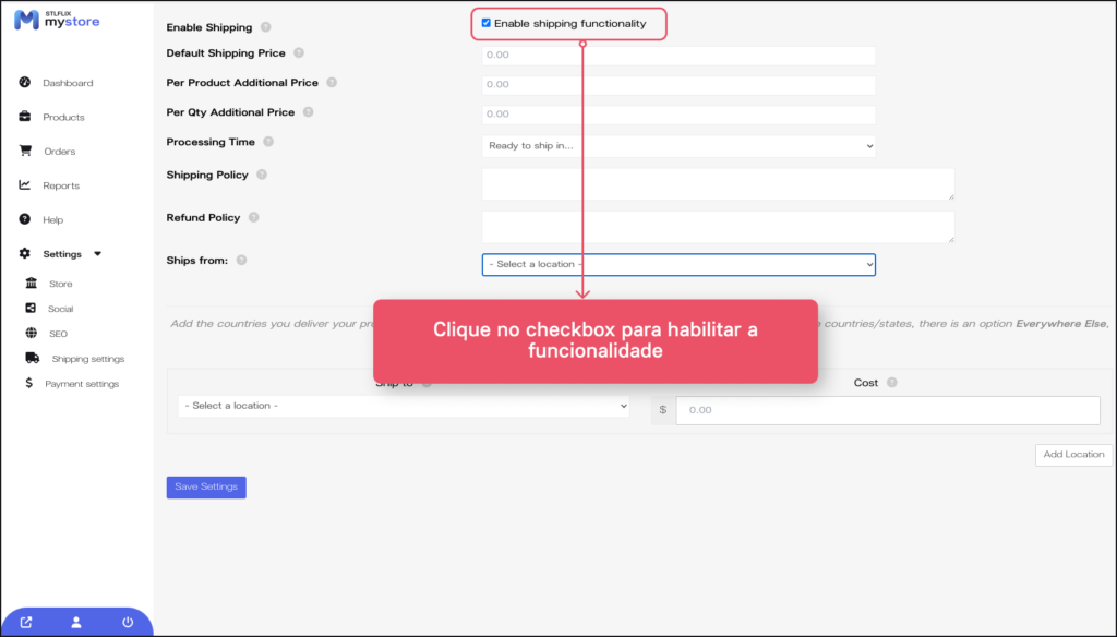 2. Clique no checkbox “Enable shipping funcionality” para ativar a funcionalidade.