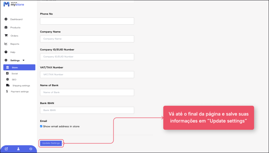 3. Após preencher as informações da sua loja é só ir até o final da página e salvar sua atividade clicando em “Update settings”. Pronto, suas configurações de loja já estão atualizadas!