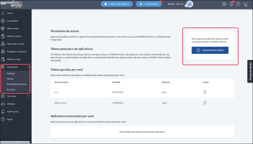1. Para configurar o Melhor Envio você precisará primeiro criar uma conta. Após criar sua conta você pode ir no painel da esquerda e selecionar > Integrações > Permissões de Acesso e “Gerar um novo token”. Pronto é só copiar o token gerado.