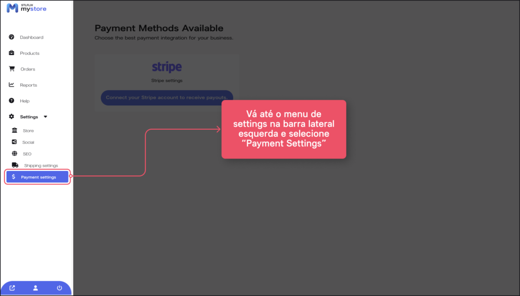 1. No menu à esquerda, acesse novamente a opção de “Settings” e escolha “Payment Settings”.