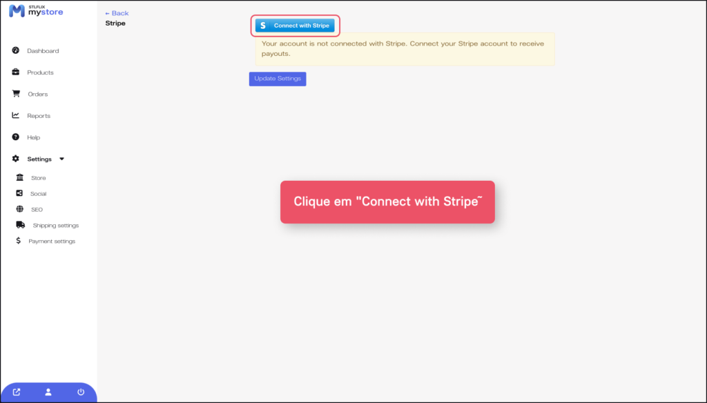 3. Você verá um aviso de que sua conta ainda não está conectada, clique em “Connect with Stripe”