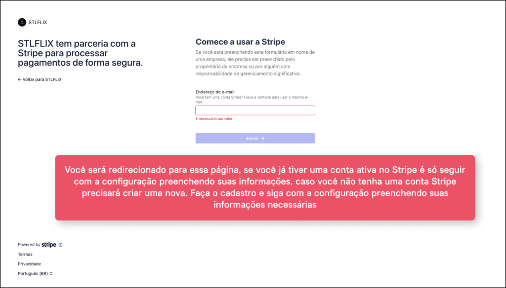4. Ao ser redirecionado para a página seguinte você precisará criar uma conta no Stripe para habilitar seu método de pagamento.