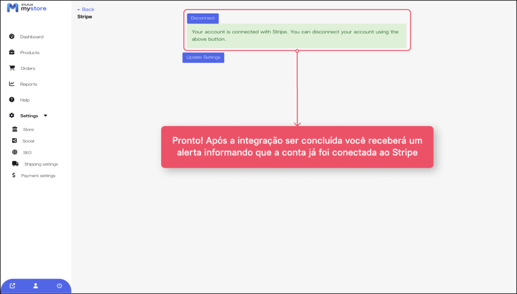 5. Feito! Você receberá um alerta que suas configurações de integração com o Stripe foram concluídas e já está ativo.