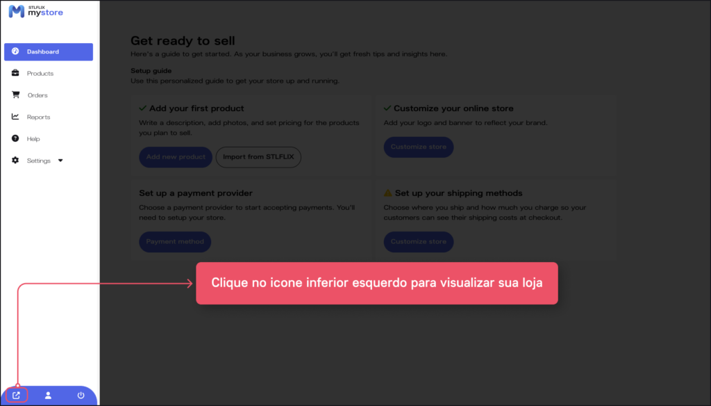 Para ver como sua loja está, você pode clicar no botão no canto inferior esquerdo do menu lateral. Você será redirecionado para uma pré-visualização da sua loja.