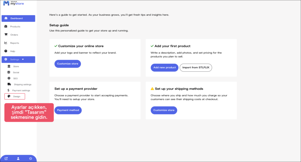 Başlamak için, üst navigasyon menüsünde “Ayarlar” butonuna tıklayın ve açılır menüden “Mağaza”yı seçin. Bu, sizi mağaza ayarları sayfasına yönlendirecek ve burada mağazanızı özelleştirmeye başlayabilirsiniz.