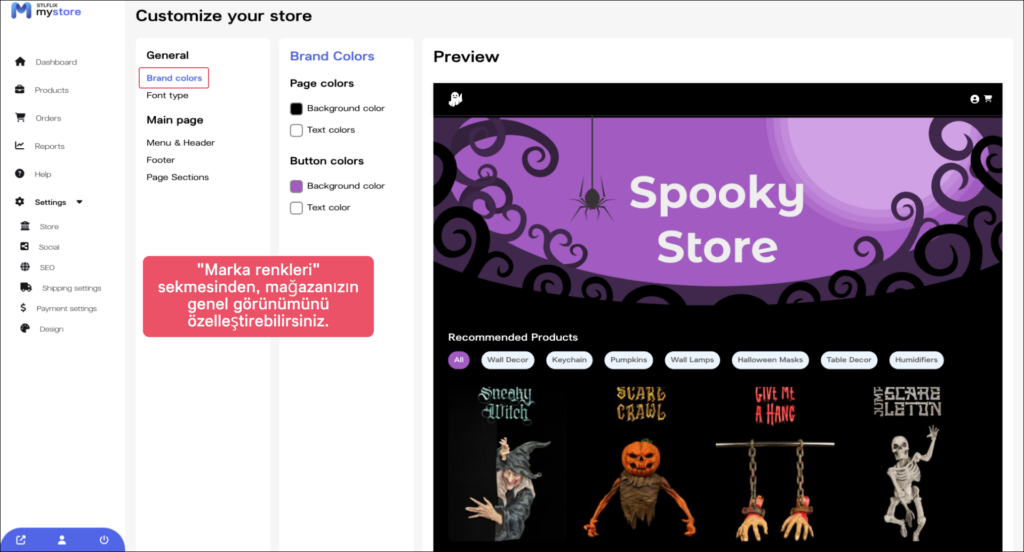 “Genel” bölümünde, mağazanızın marka renklerini seçebilirsiniz. “Marka Renkleri” sekmesine tıklayın ve markanızı temsil eden renkleri seçin. Ayrıca, kendi özel renklerinizi de yükleyebilirsiniz.