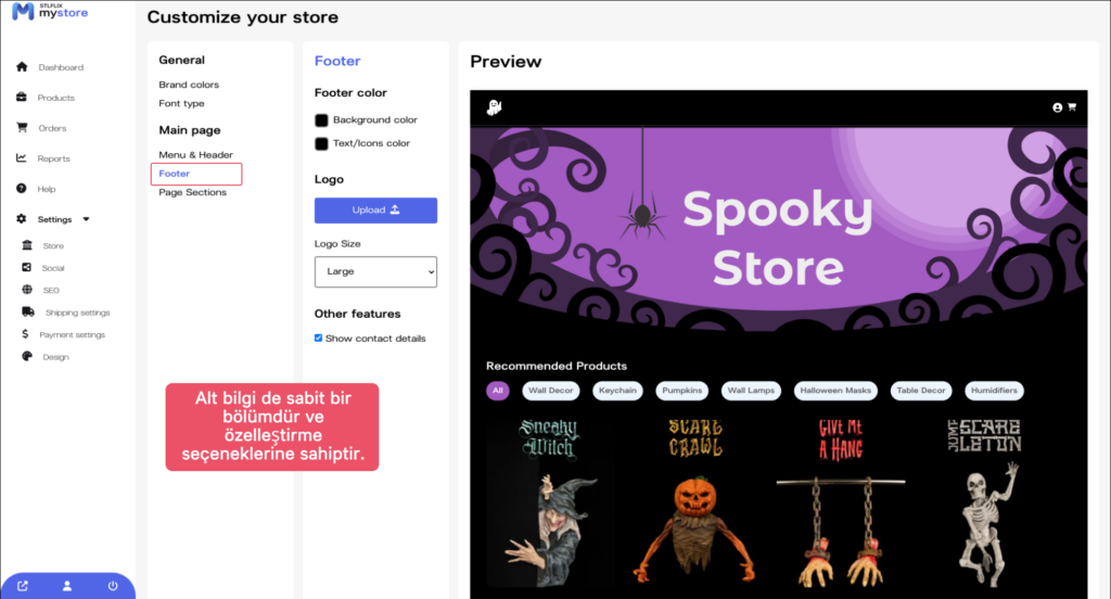 Sonraki adımda, mağazanızın altbilgisini (footer) özelleştirin. “Altbilgi” sekmesine tıklayın ve görüntülemek istediğiniz bilgileri eklemek için ayarları düzenleyin.